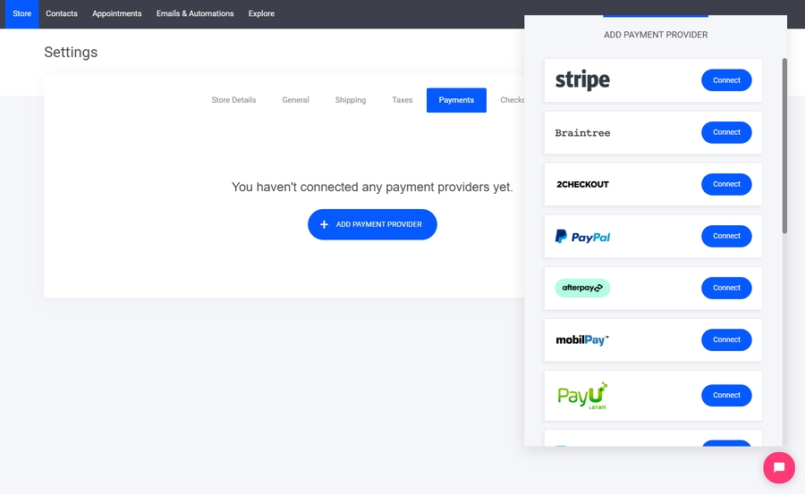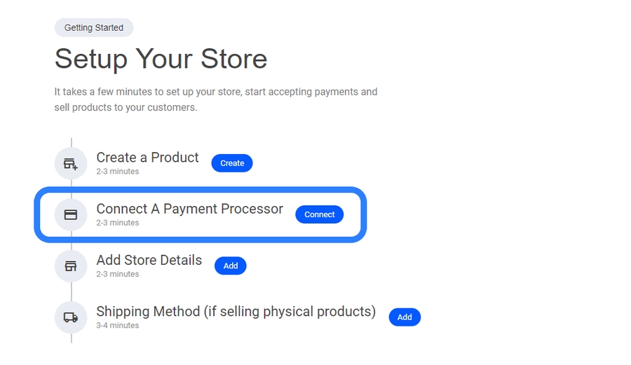 To start receiving payment for your ecommerce store products, select the 'Connect a payment processor' tab