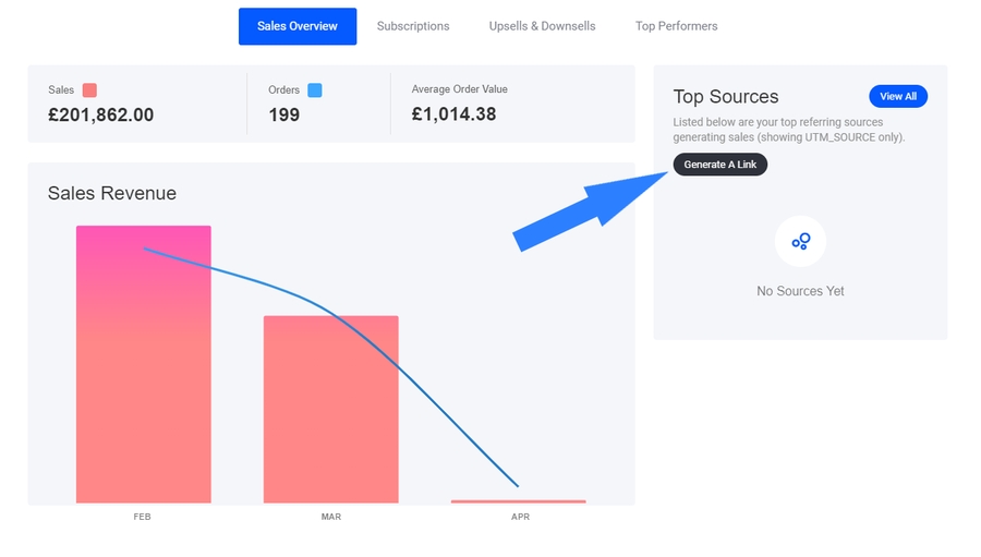 Once your link starts to generate traffic you can view all the data in the Top Sources Tab:Note, source data can also be viewed within the users dashboard 'CRM' properties