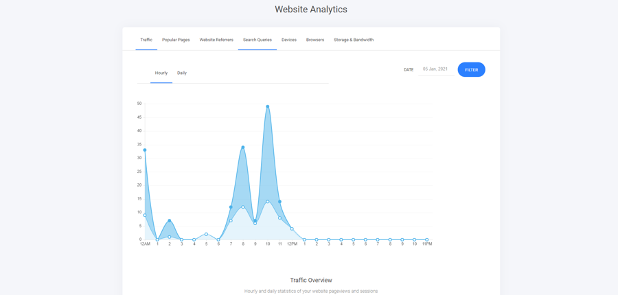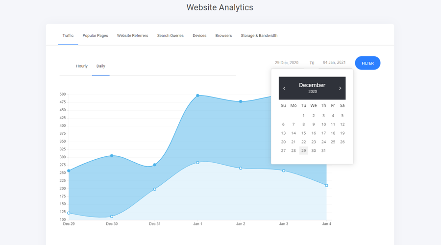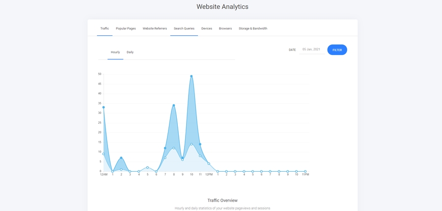 See hourly/daily website traffic to all your pages. By selecting the daily tab and setting your date time frame in the date tab to the right hand side. You can get a full picture on what's happening on your site, regards to traffic and visitors.