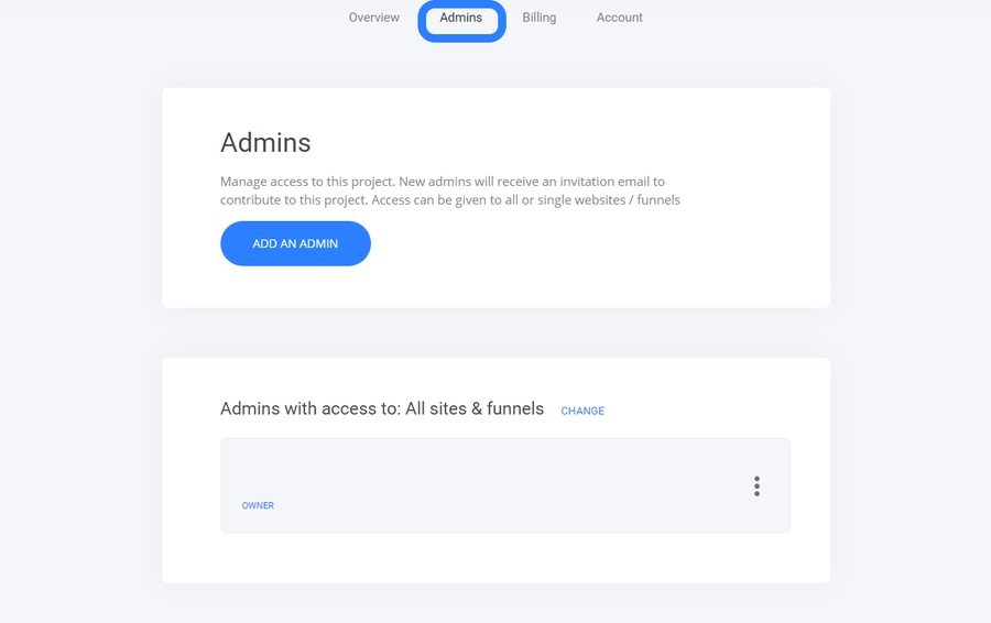 You can quickly add admins to your website to help you with your designing to management.Set your admin permissions and simply type in the email address of your admin and they will get an email inviting them to be admin.By selecting the change tab. This enables you to give permissions on other projects or funnels you are either working on. Or if you are selling your funnels. This is where you can allow access to your funnels.Got 5 funnels in your plan? But only use 1... Create a landing page and sell the remaining 4 on a monthly subscription. win win.