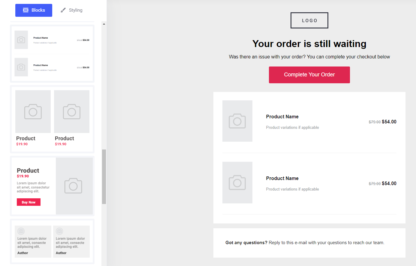 Sur le côté gauche, vous verrez les éléments de l'e-mail à glisser-déposer. Faites défiler l'écran jusqu'à la moitié de la page et vous verrez le nouvel élément de panier abandonné. Il vous suffit de le glisser dans votre e-mail et le tour est joué !