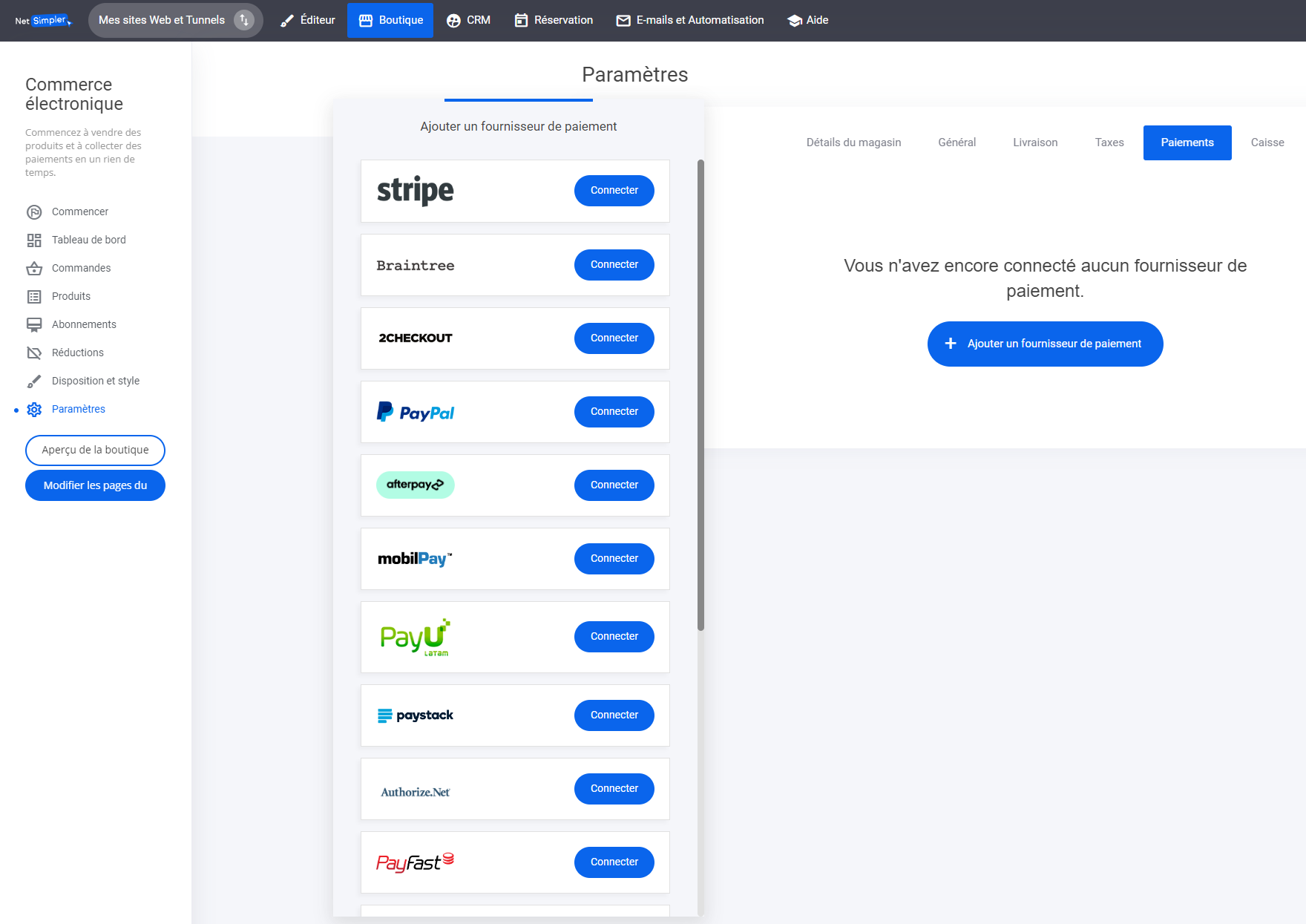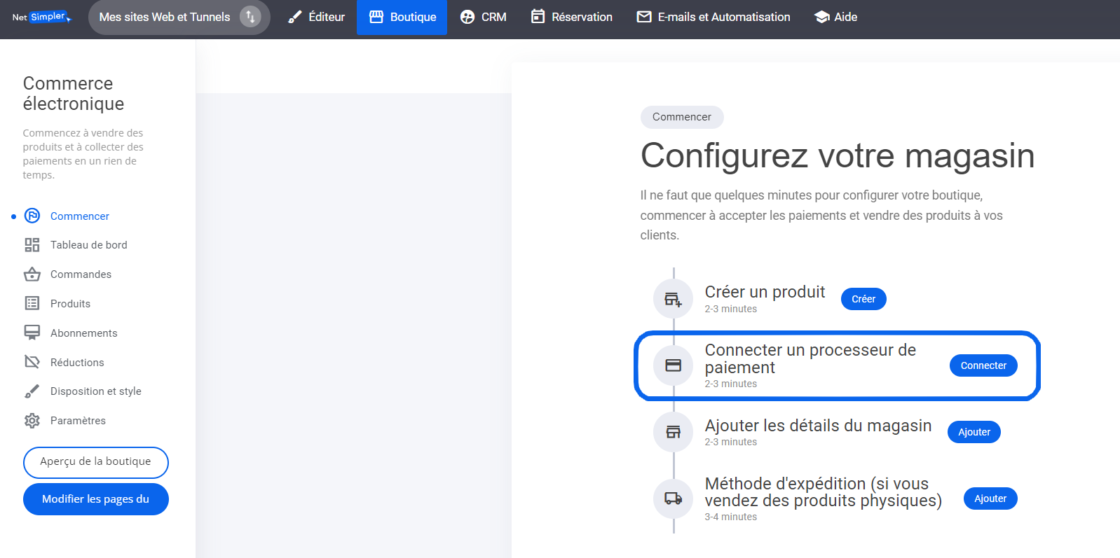 Pour commencer à recevoir des paiements pour les produits de votre boutique ecommerce, sélectionnez l'onglet '**Connecter un processeur de paiement**'