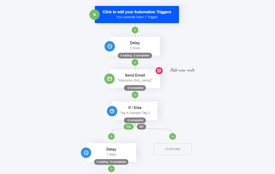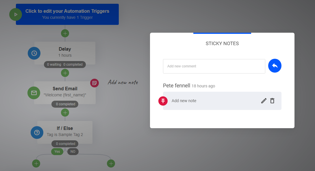 En sélectionnant la fonction "notes", vous ou les membres de votre équipe pouvez laisser des notes utiles à chaque étape de l'entonnoir d'automatisation. Cela peut s'avérer très utile pour vous rappeler les informations relatives à l'étape, ou simplement pour ajouter des instructions à compléter par votre équipe. Écrivez-le, enregistrez-le, épinglez-le.