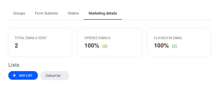 Si vous souhaitez voir comment un abonné spécifique participe à vos campagnes d'e-mailing, vous pouvez vous rendre dans l'onglet CRM/Contacts > sélectionner l'abonné > puis sélectionner l'onglet Détails marketing - comme indiqué ci-dessous.